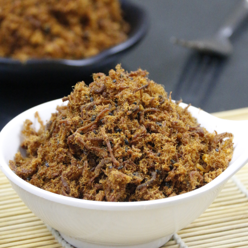 Finely shredded meat fibers with a fluffy texture, crispy and savory taste, visually appealing golden color. Primarily used as a topping for pastries, rice balls, sushi, xiaobei (mini buns), and bread. Also suitable as a filling for sushi and other pastries