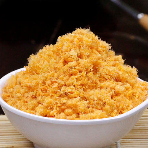 Finely shredded meat fibers with a fluffy texture, crispy and savory taste, visually appealing golden color. Primarily used as a topping for pastries, rice balls, sushi, xiaobei (mini buns), and bread. Also suitable as a filling for sushi and other pastries
