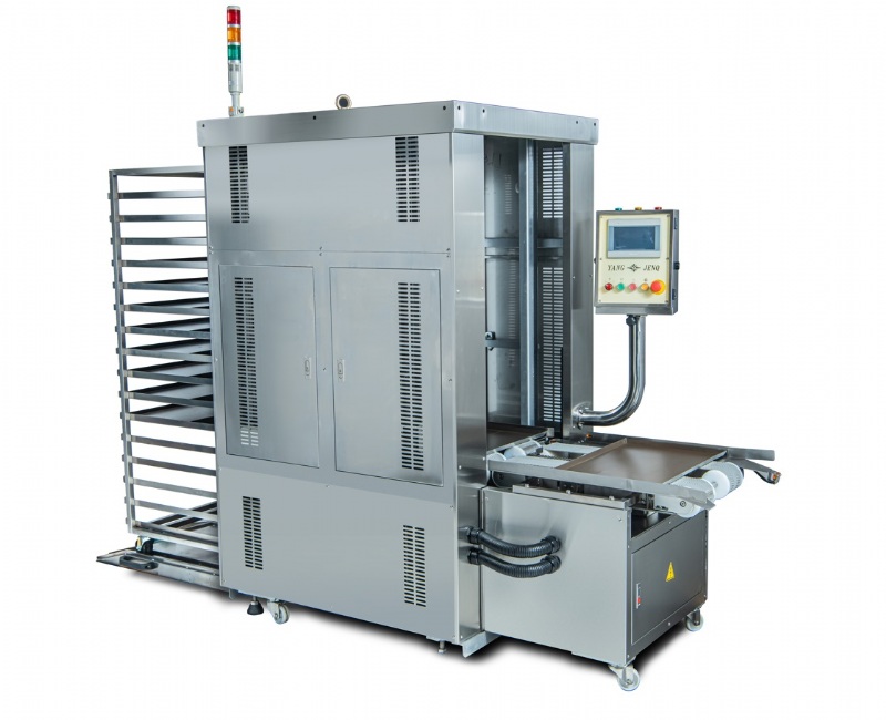 This machine can be used with YJ-860 automatic tray arrangement machine. The operation panel is man-machine system, PLC program control, servo motor positioning system, product positioning is accurate, and there is a manual setting page to adjust the positioning distance of the tray according to the product status and has an alarm. Buzzer function, easy to operate, is an economical and affordable new model. Steaming tray specification (605x605x10mm) floor-standing, a total of 15 layers, a single layer can be inserted into a single plate, and a second layer can be inserted into the plate (a total of 15 plates) Baking tray specification (600x400x20mm) floor type, a total of 16 layers, a single layer can be inserted into two trays, and a second layer can be inserted into the tray (a total of 32 trays)